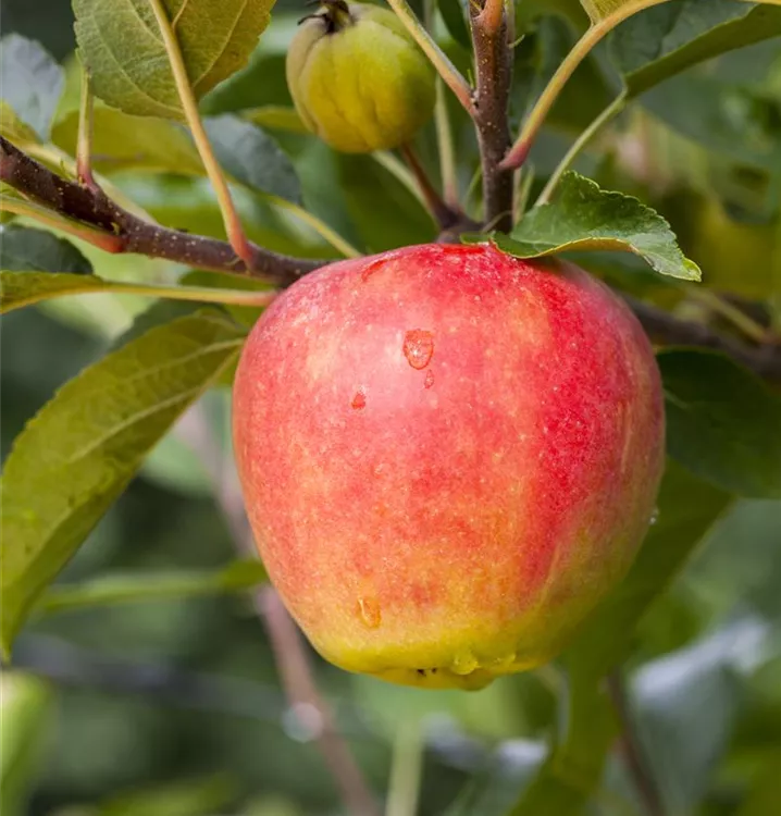 Malus domestica 'Rebella'® bildet gelb-rote, runde Früchte.