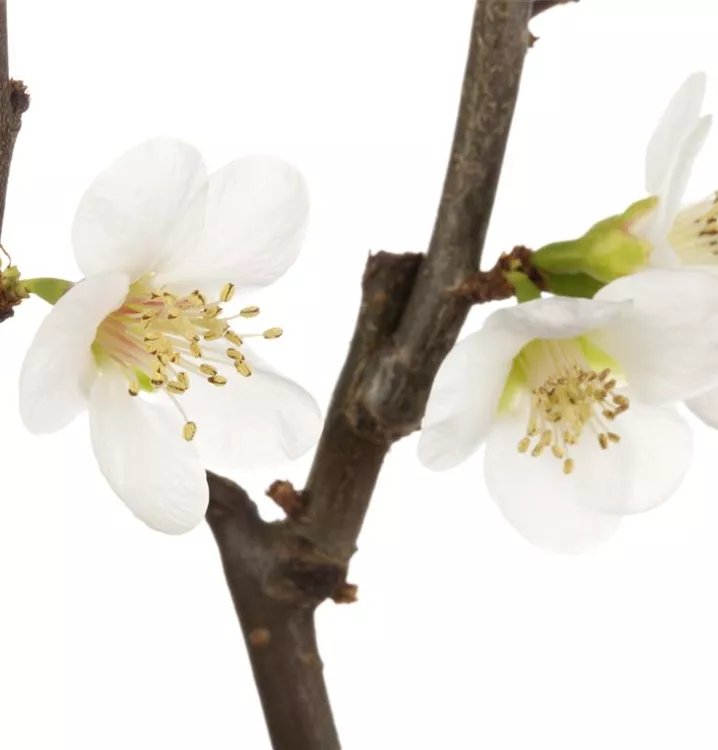 Die Zierquitte 'Jet Trail' bildet weiße Blüten von April bis Mai.
