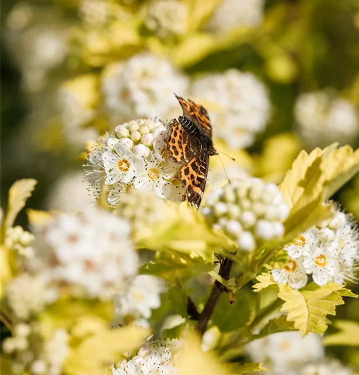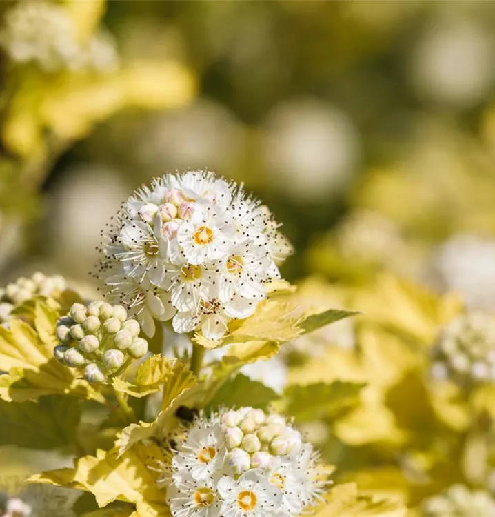 Die weißen Blüten der Fasanenspiere 'Dart´s Gold' erscheinen in Doldentrauben von Juni bis Juli.