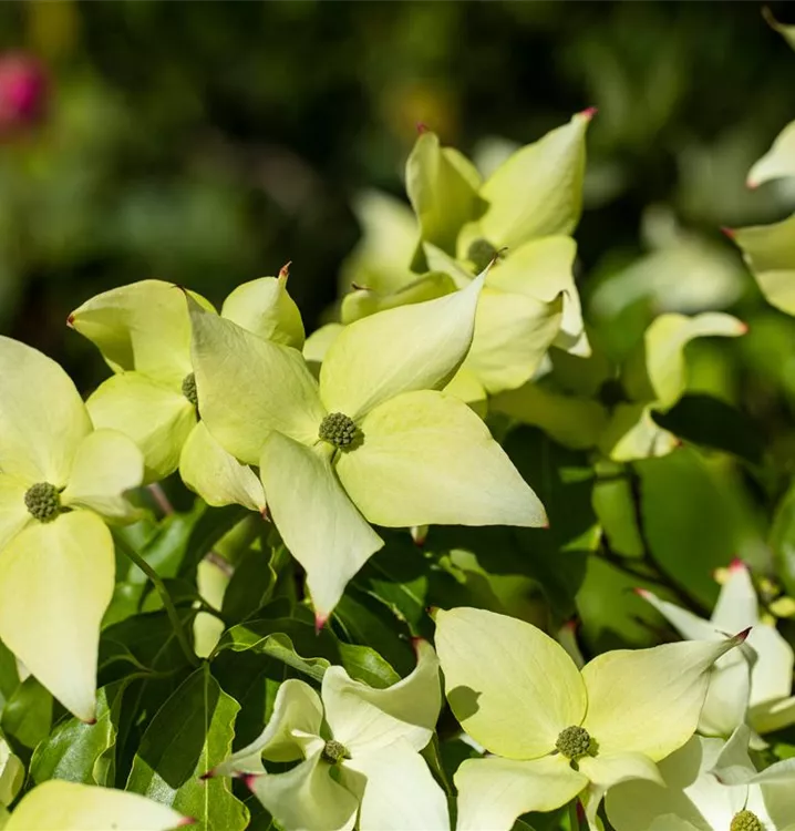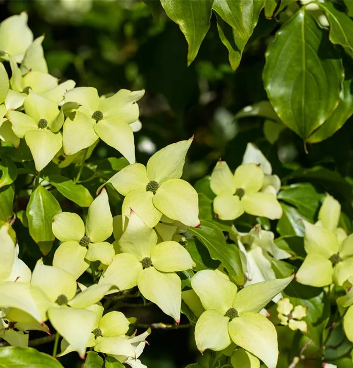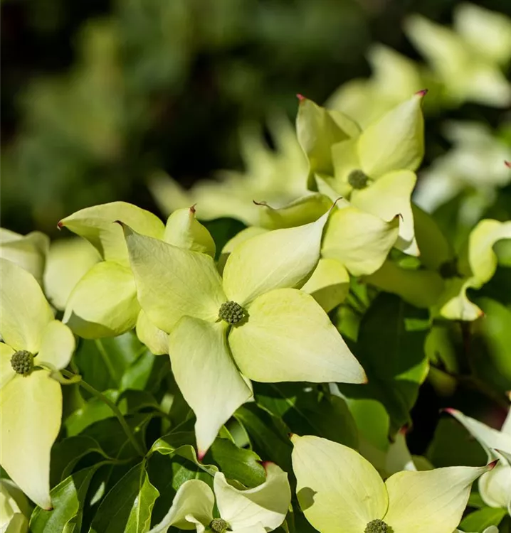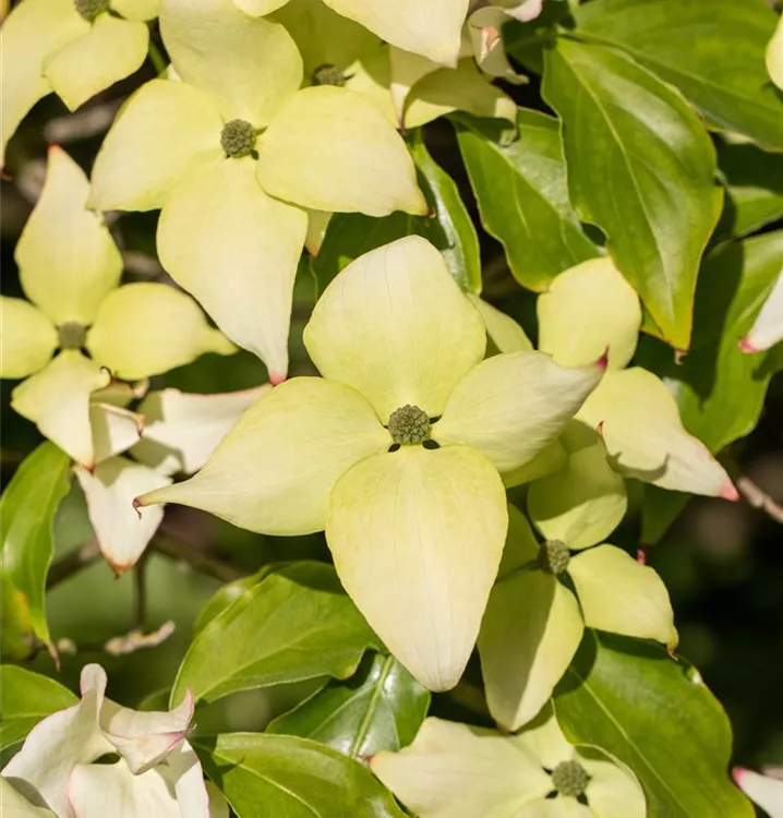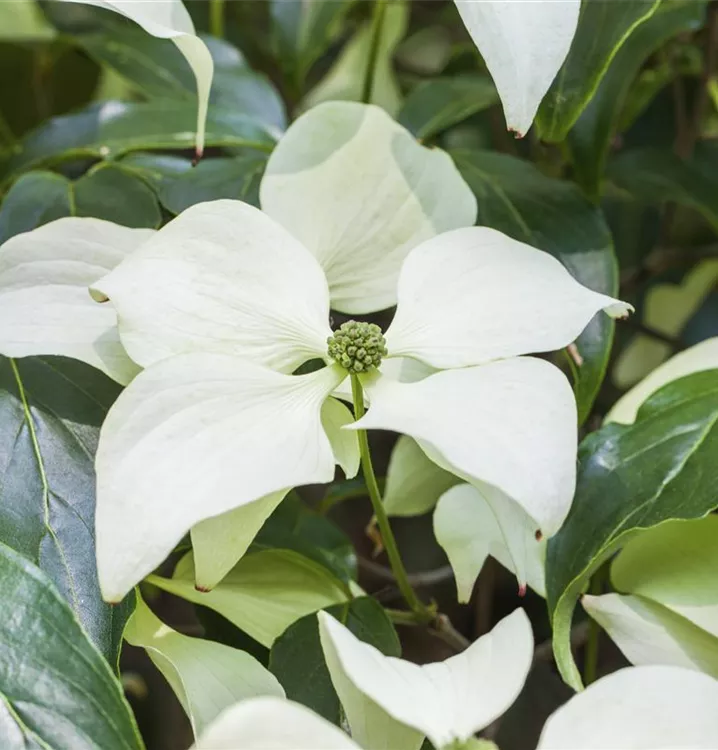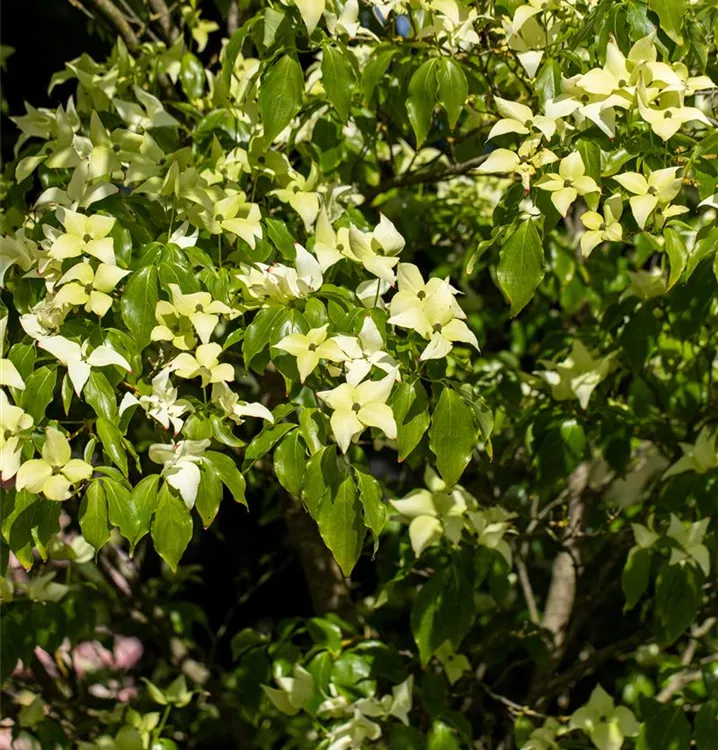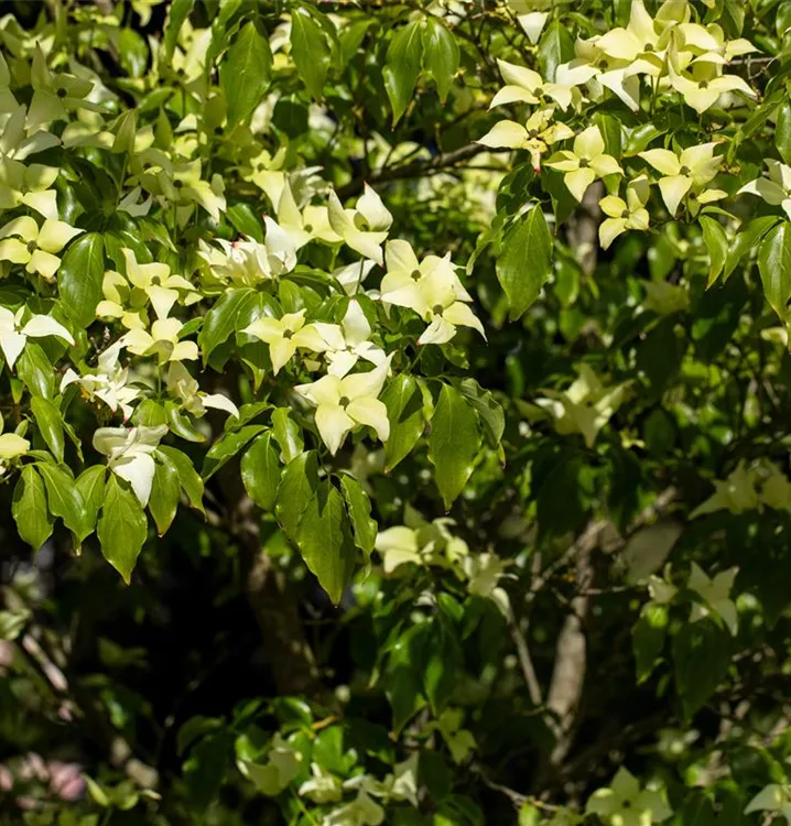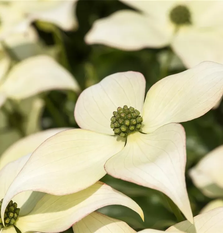 Die cremeweißen Blüten des Japanischen Blumen-Hartriegel 'Schmetterling' erscheinen in Dolden im Juni.