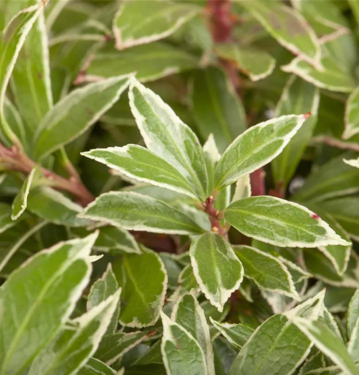 Weißlich abgesetzte Blattränder, dunkelrotes junges Laub und schneeweiße Blütenkronen!
