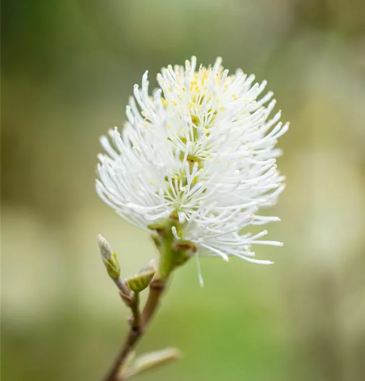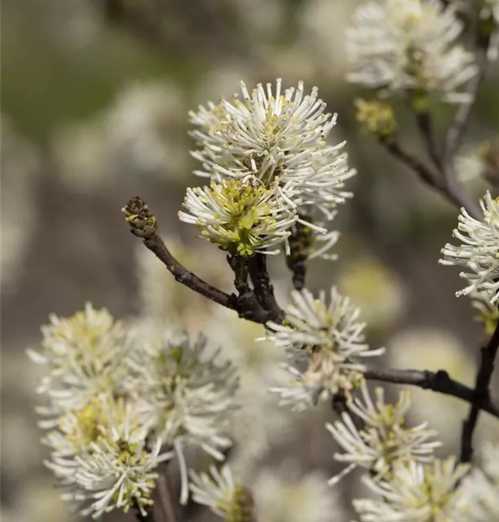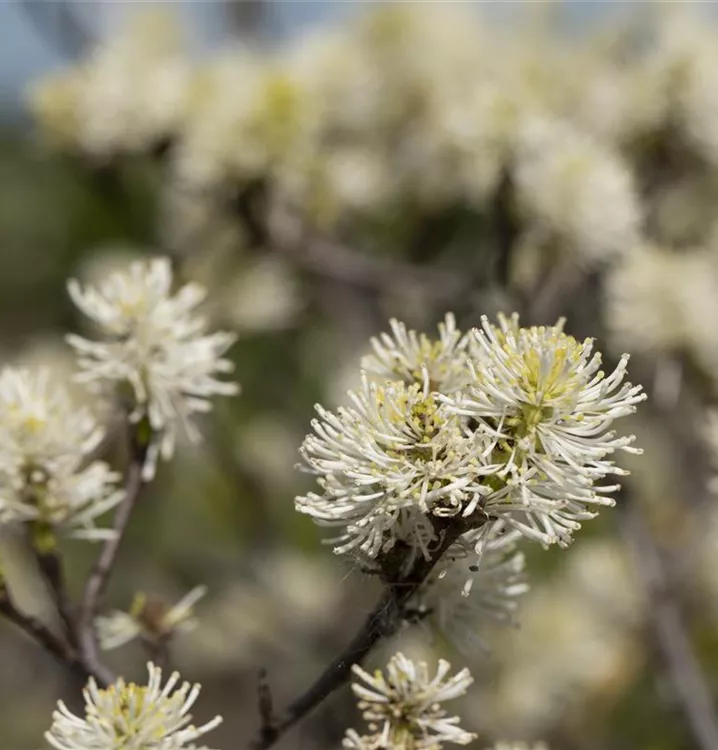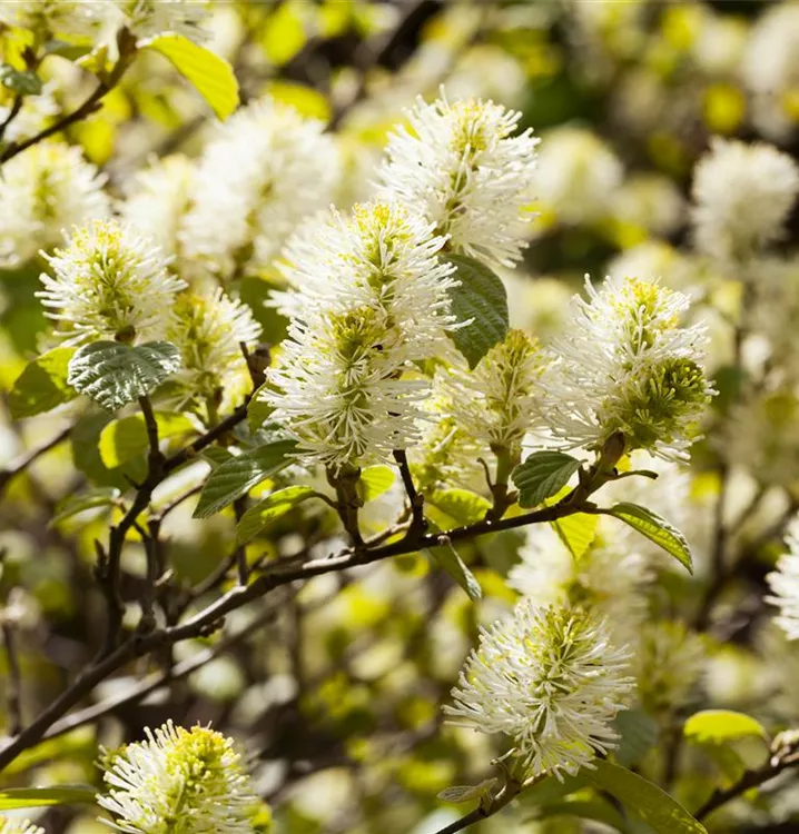 Der Große Federbuschstrauch (Fothergilla major) ist ein Strauch, der weiße, in Ähren angeordnete Blüten mit einem starken Duft hervorbringt. Sie erscheinen im Mai.