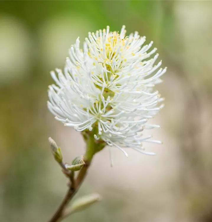 Die weißen Blüten des Großen Federbuschstrauch erscheinen in Ähren im Mai. Diese werden etwa 2 - 5 cm groß und sind stark duftend.