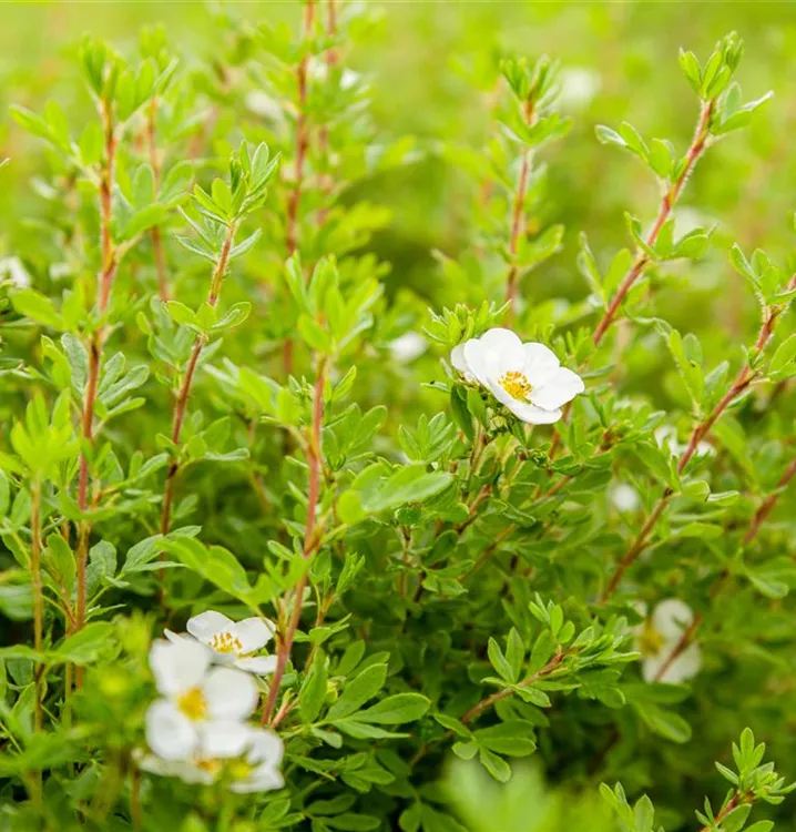Potentilla fruticosa 'Abbotswood' ist ein Flachwurzler und bildet, je nach Boden, fein verzweigte Wurzeln.