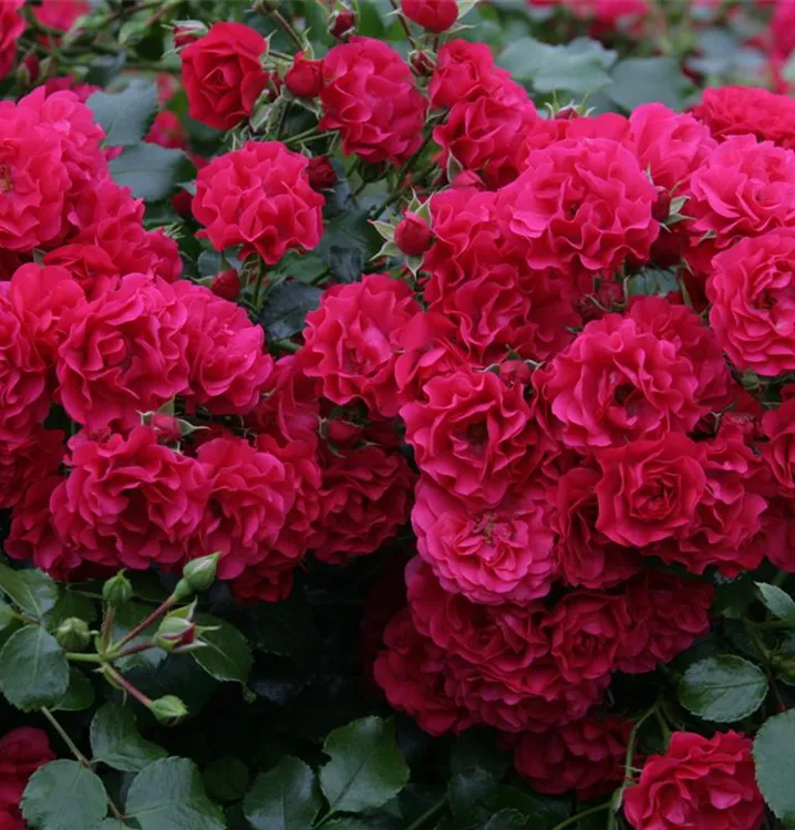 Die rosaroten, starkgefüllten, schalenförmigen Blüten der Bodendeckerrose 'Gärtnerfreude'® erscheinen in Dolden von Juni bis September. Diese werden etwa 2 - 3 cm groß.