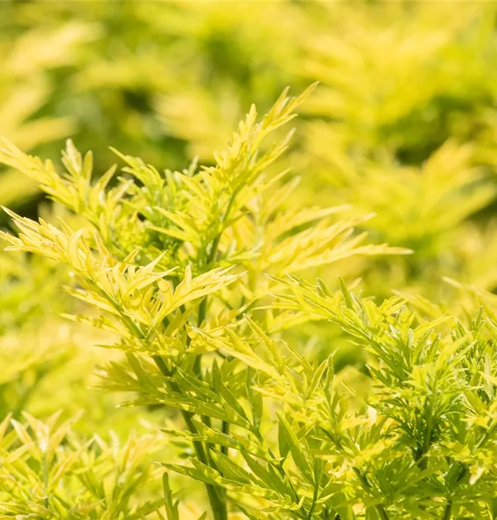 Die sommergrünen Blätter des Schwarzen Holunders 'Golden Tower' sind grüngelb, gefiedert, gegenständig.