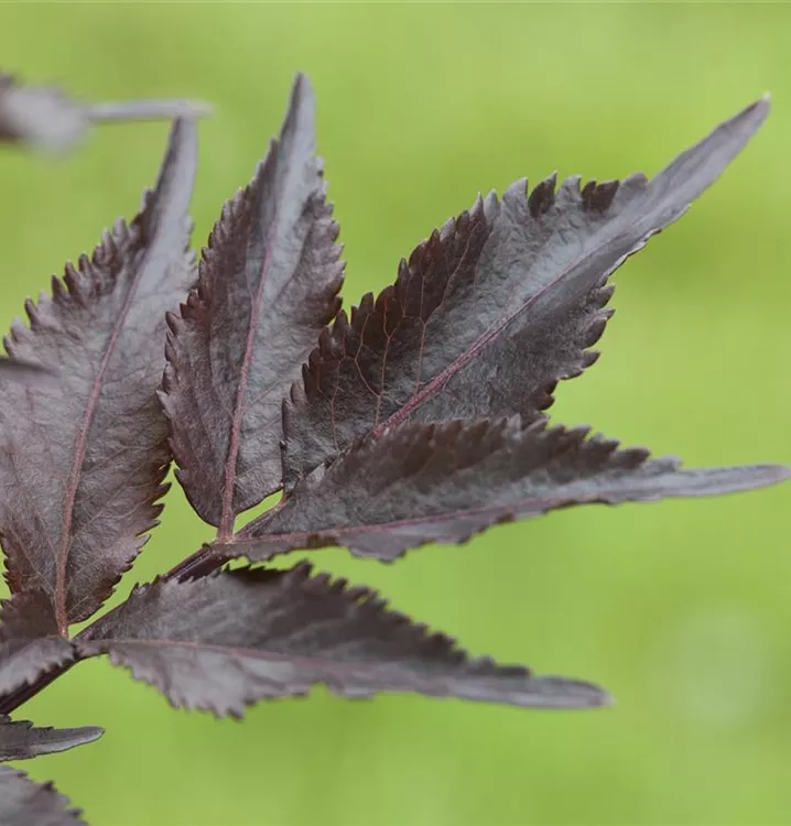 Hoher Blattschmuckwert. Die sommergrünen Blätter des Schwarzen Holunders 'Black Beauty'® sind rot-braun, gefiedert, gegenständig. Schwarzer Holunder 'Black Beauty'® zeigt sich leuchtend gelb-rot im Herbst. Lange haftend.