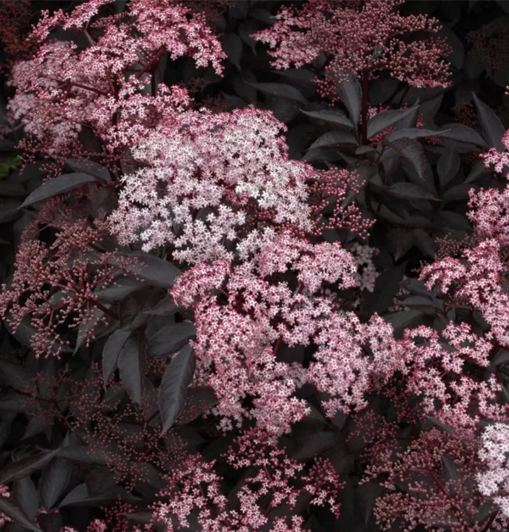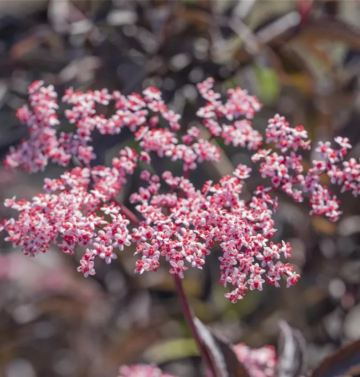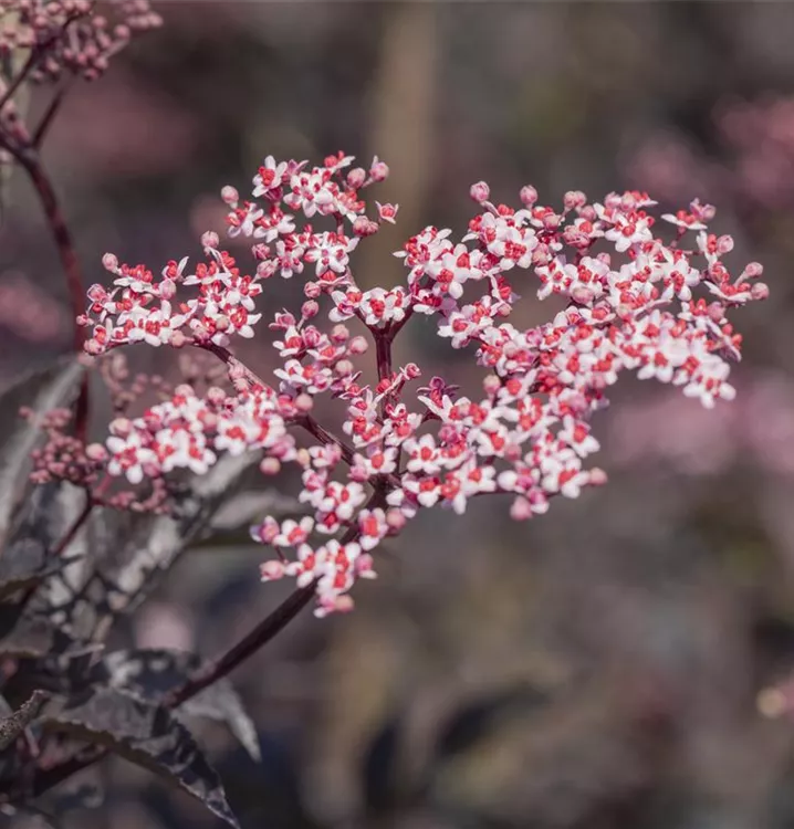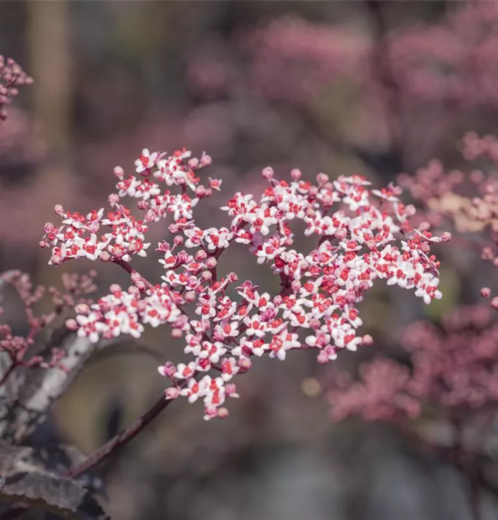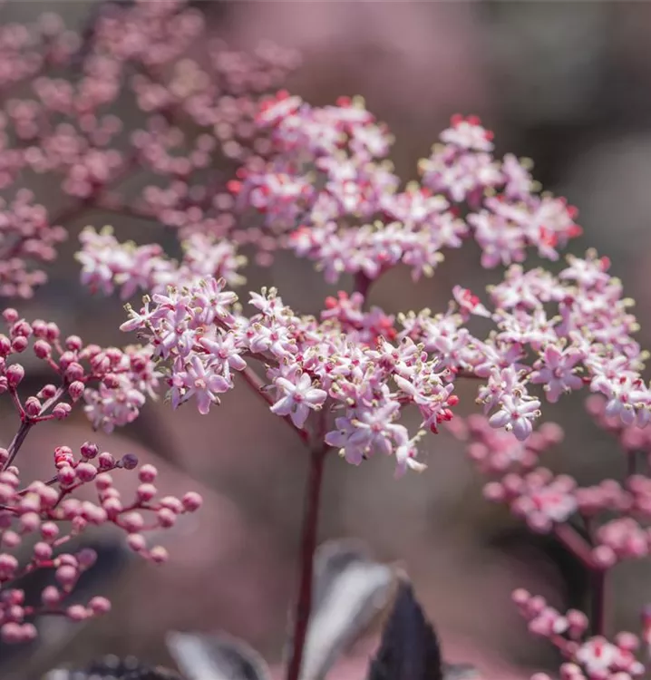 Die rosafarbenen Blüten des Schwarzen Holunder 'Black Beauty'® erscheinen in Schirmtrauben von Mai bis Juni. Diese sind leicht duftend.