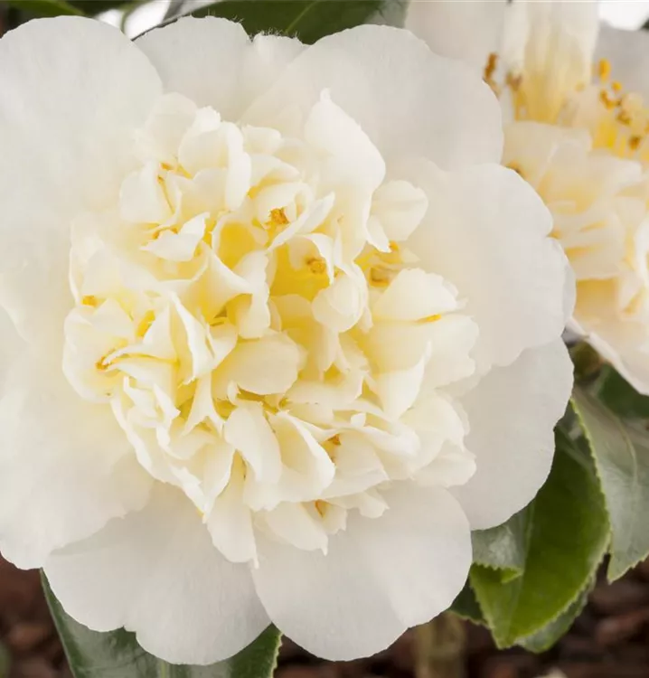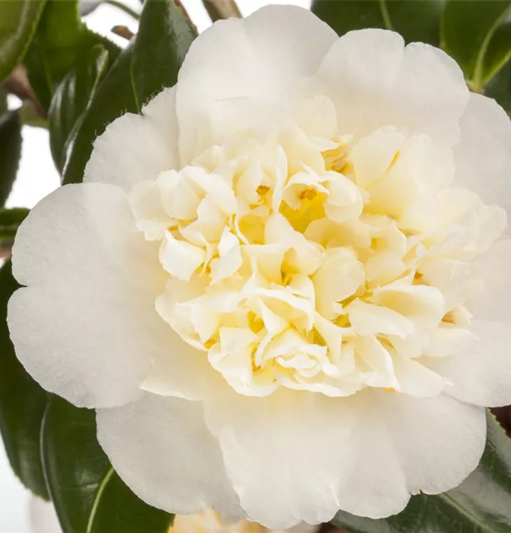 Camellia japonica 'Brushfield Yellow' bildet während der gesamten Saison zahlreiche gefüllte, hellgelbe Blüten.