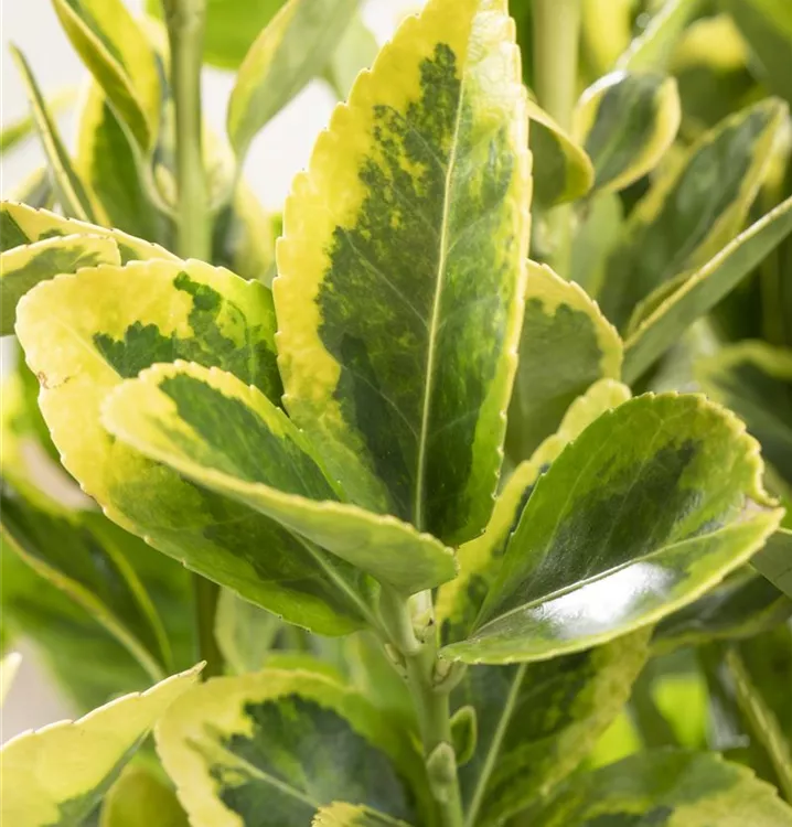 Die immergrünen Blätter des Japanspindels 'Microphyllus Pulchellus' sind gelbbunt, eiförmig, gesägt.