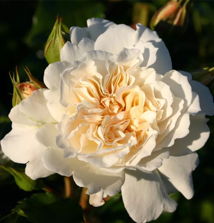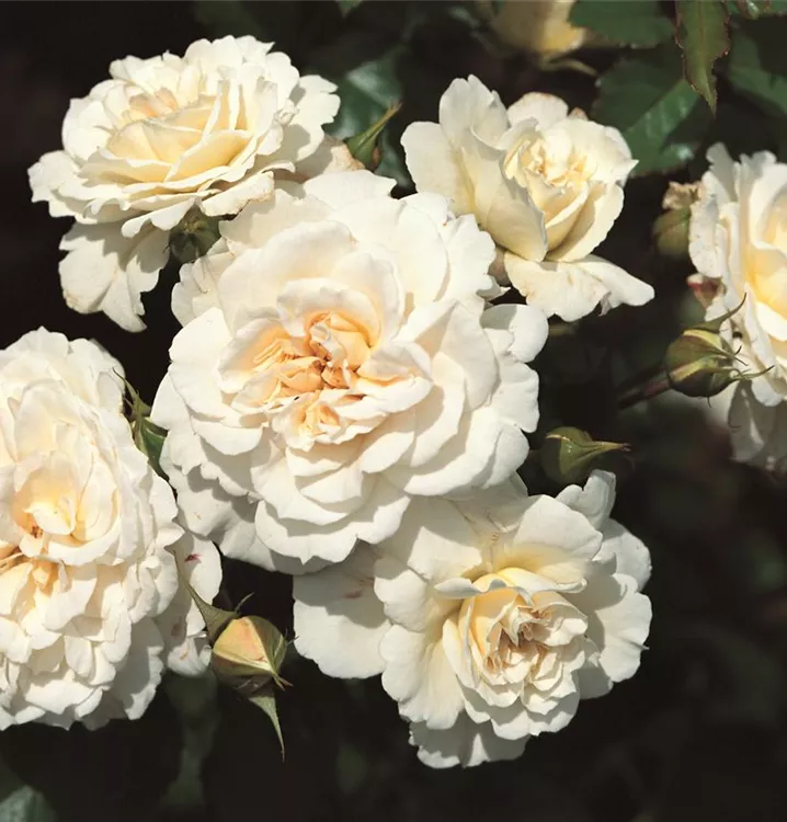 Die cremeweißen, starkgefüllten, schalenförmigen Blüten der Beetrose 'Petticoat'® erscheinen in Dolden von Juni bis September. Diese werden etwa 6 - 7 cm groß und sind leicht duftend.