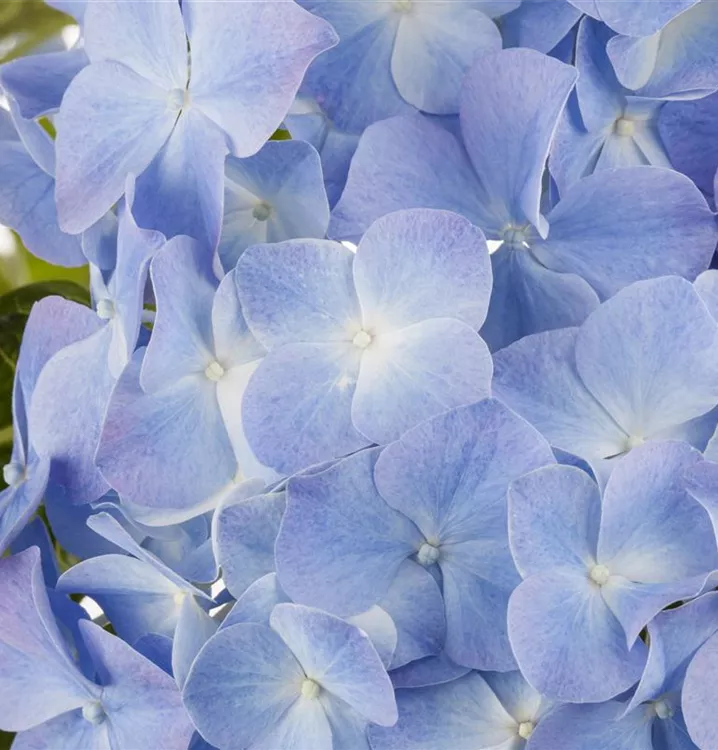 Die blauen, schalenförmigen Blüten der Bauernhortensie erscheinen in Dolden von Juni bis September.
