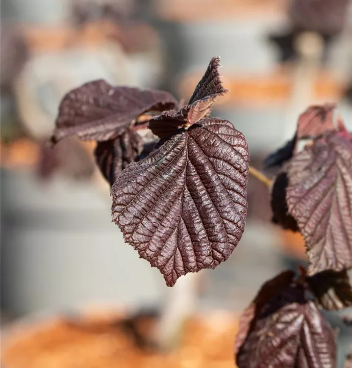 Hoher Blattschmuckwert. Die sommergrünen Blätter der Bluthasel 'Purpurea' sind schwarz-rot, rundlich, wechselständig, gesägt. Roter Austrieb.