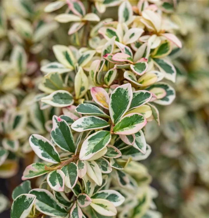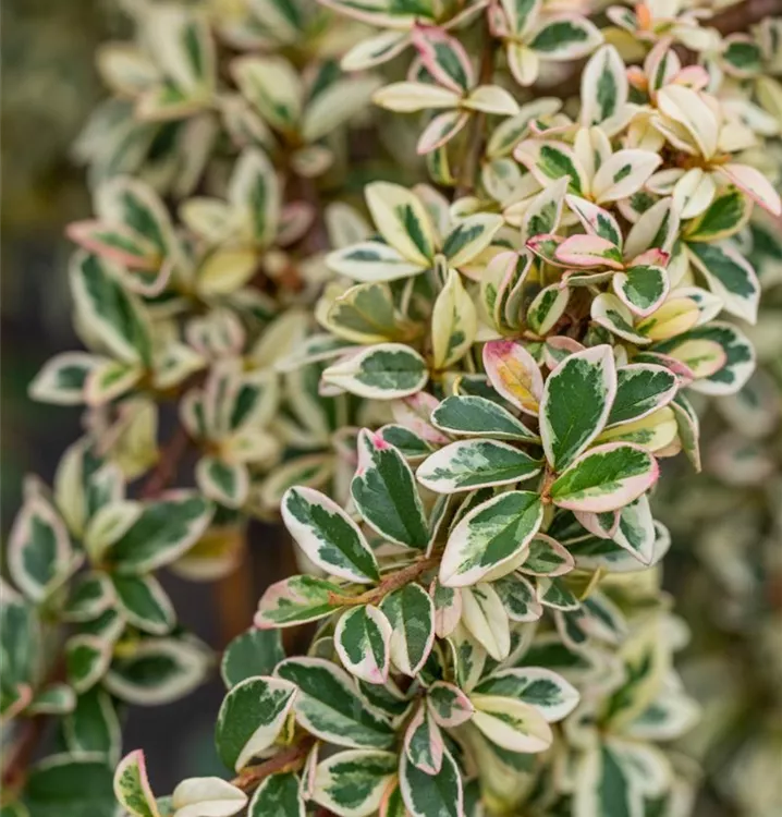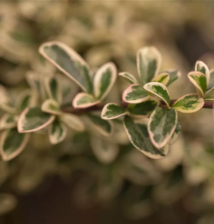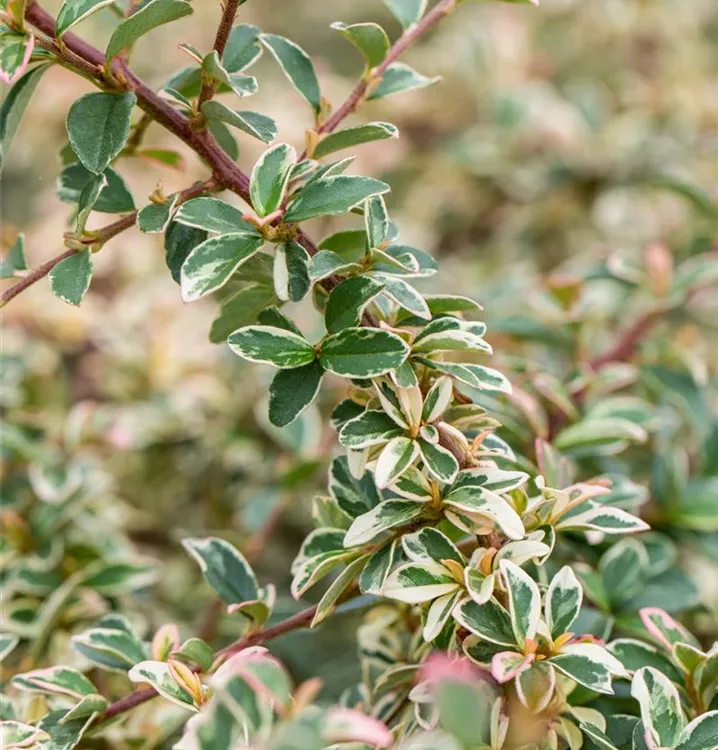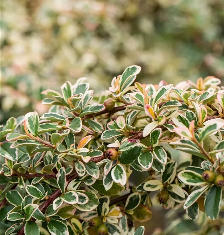 Die immergrünen Blätter der Kriechmispel 'Juliette' sind grün-weiß, rundlich, wechselständig.