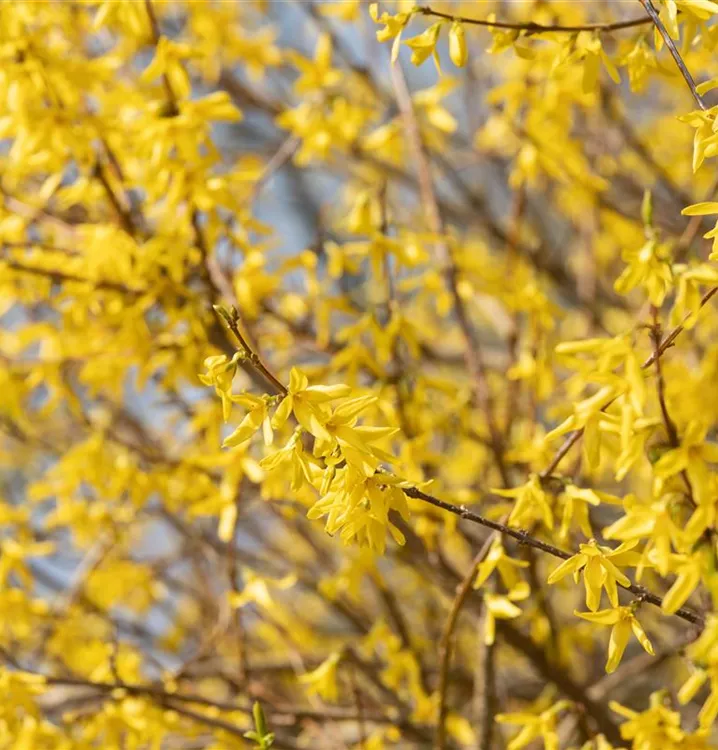 Die gelben Blüten der Forsythie 'Maree d'Or'® erscheinen in Rispen von März bis Mai.