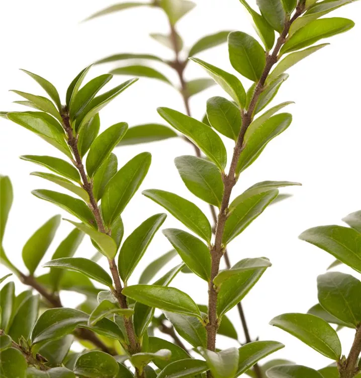 Die immergrünen Blätter der Heckenmyrte 'Twiggy' sind mittelgrün, rundlich, gegenständig. Diese sind etwa 1 - 2 cm groß.