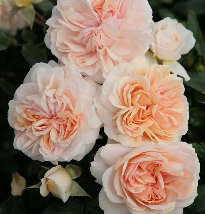 Die cremeweiß-rosafarbenen, starkgefüllten, schalenförmigen Blüten der Beetrose 'Garden of Roses'® erscheinen in Dolden von Juni bis September. Diese werden etwa 5 - 7 cm groß und sind leicht duftend.