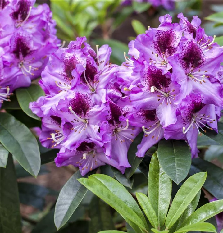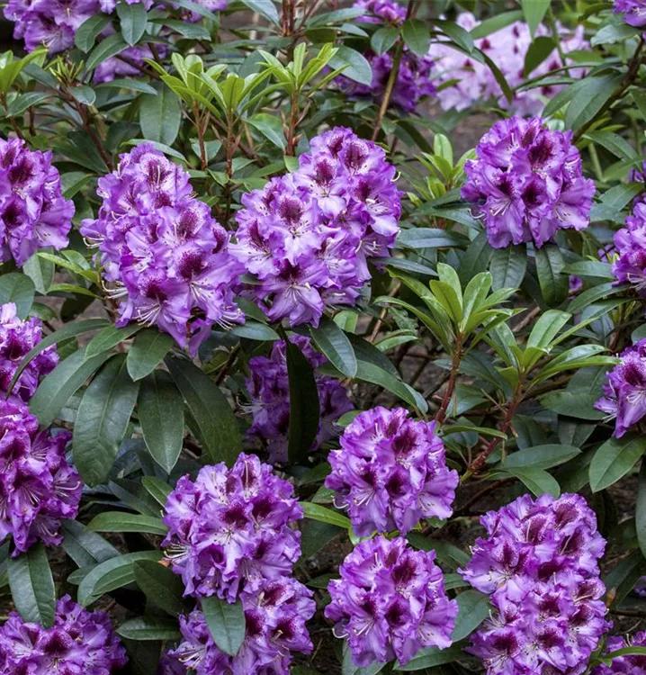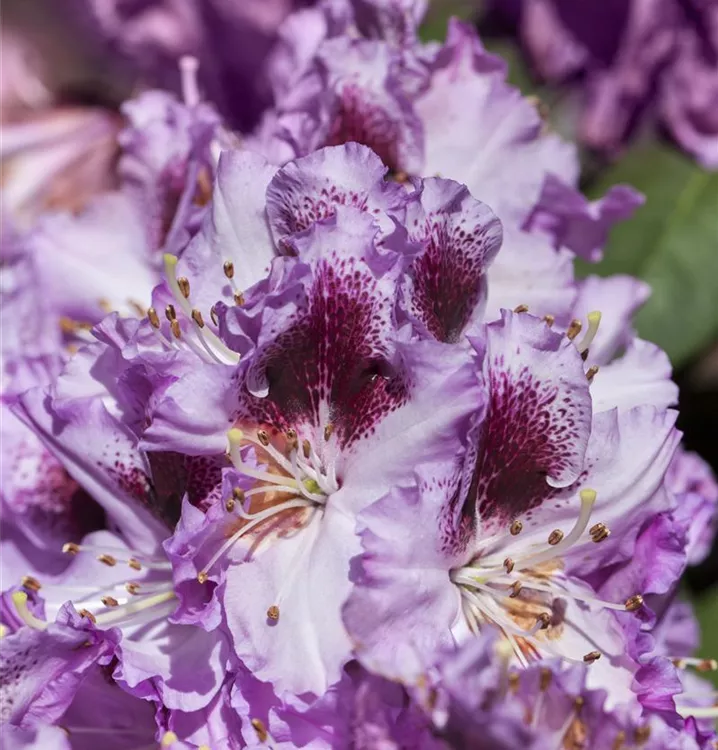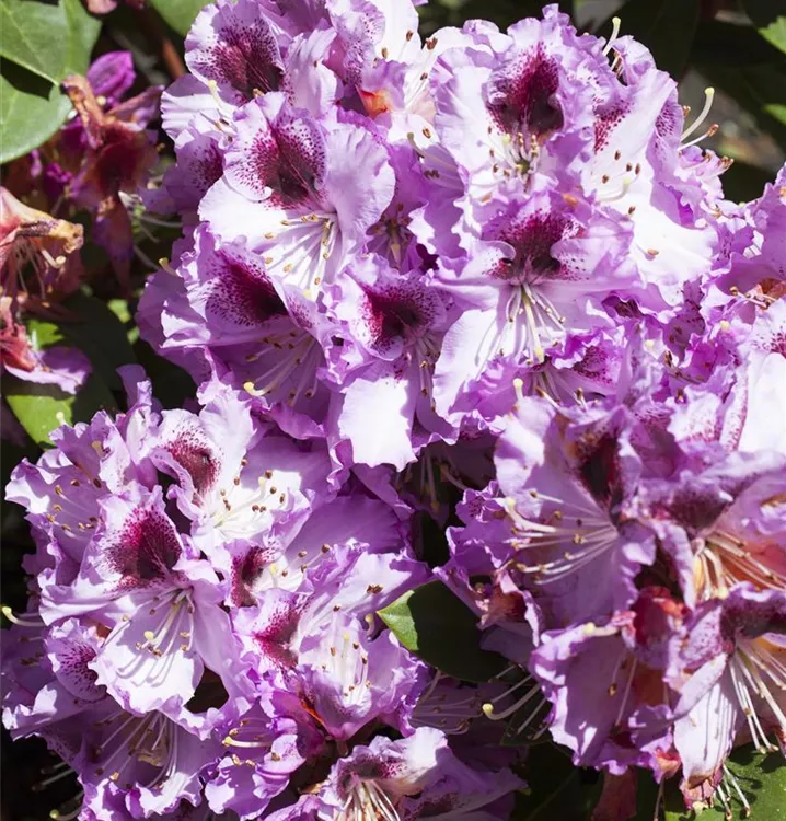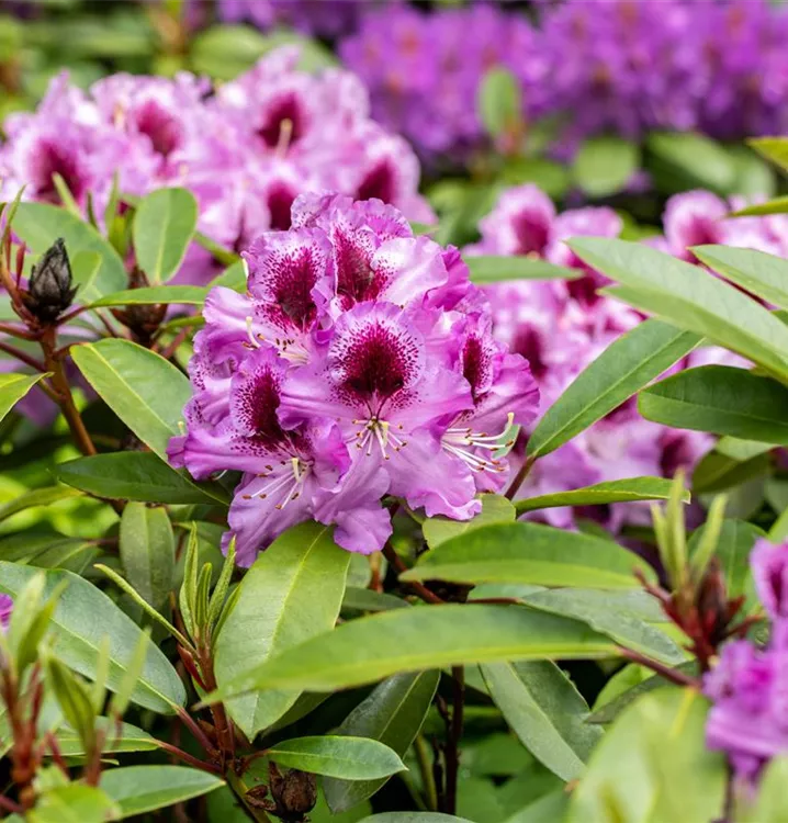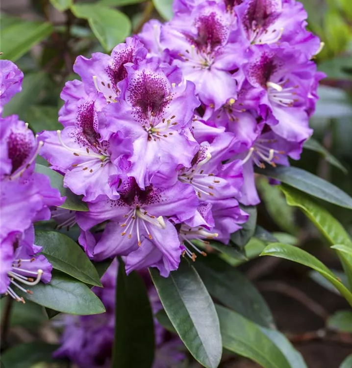 Rhododendron 'Pfauenauge'® bildet von Ende Mai bis Mitte Juni zahlreiche trichterförmige, in Dolden angeordnete, lilafarbene Blüten mit dunkelroter Zeichnung.
