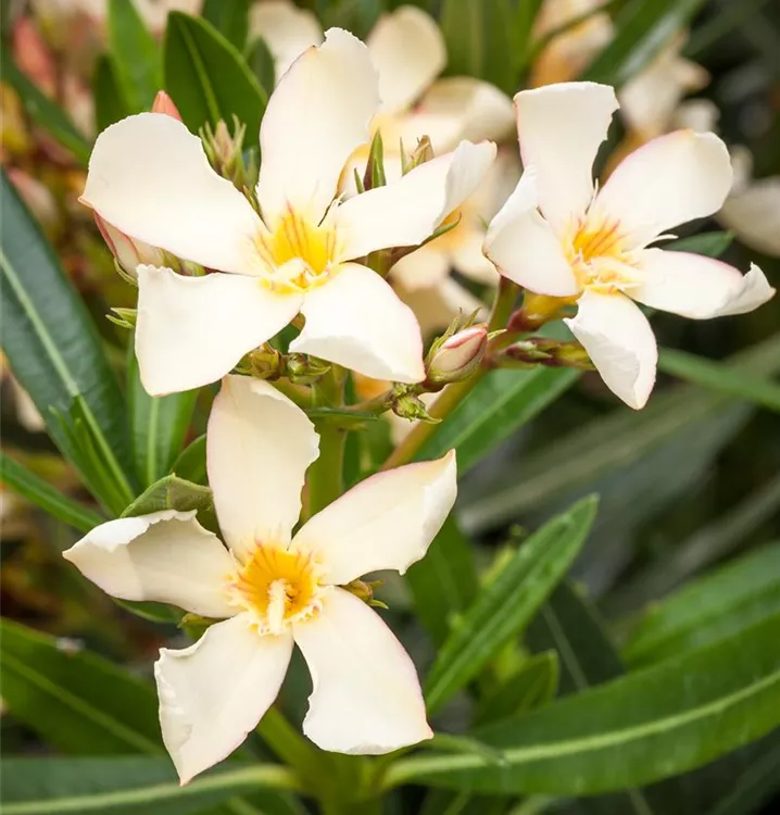 Die immergrünen Blätter des Oleanders sind dunkelgrün, lanzettlich.