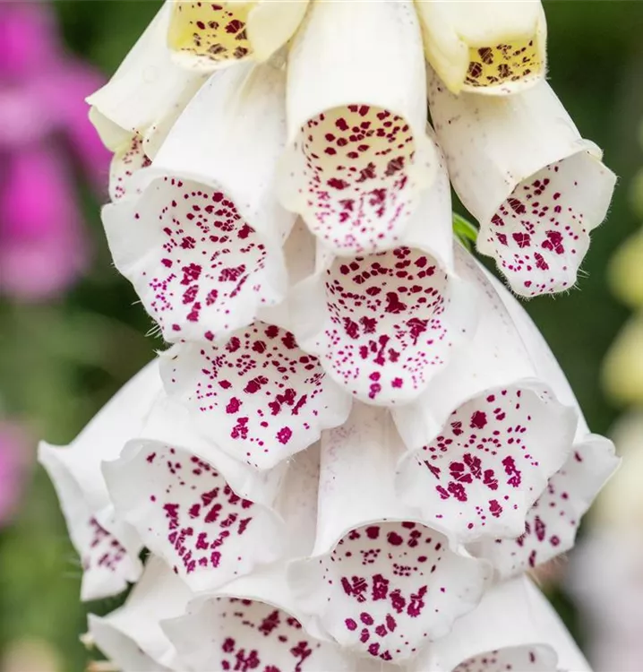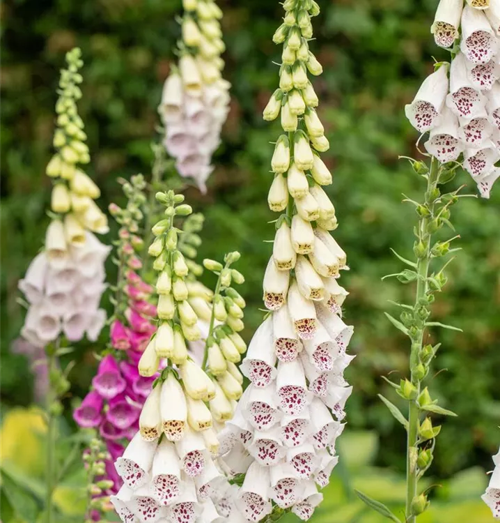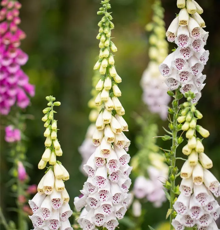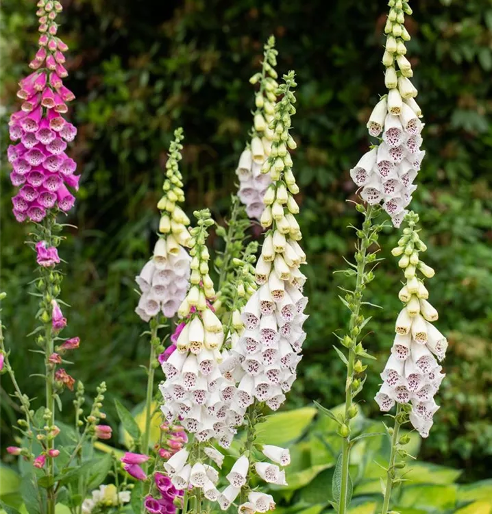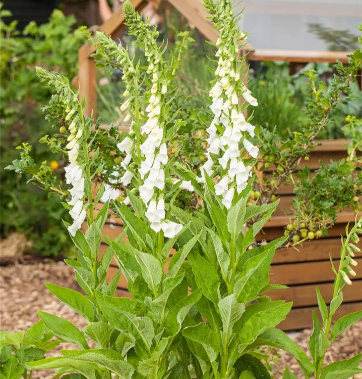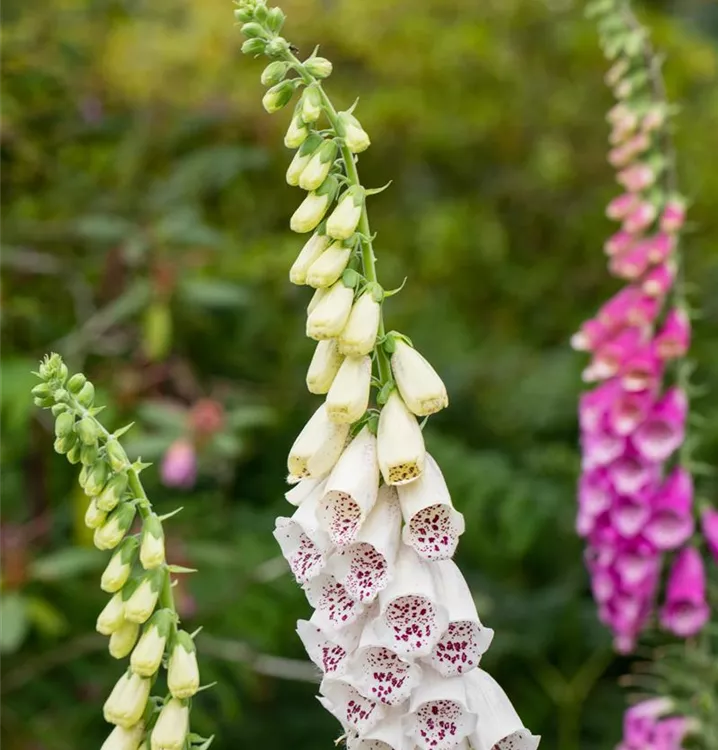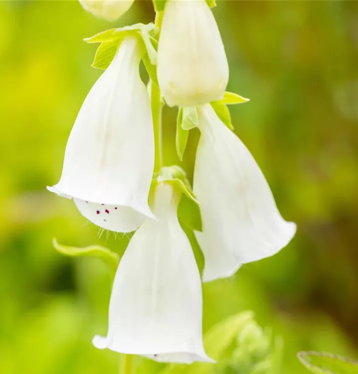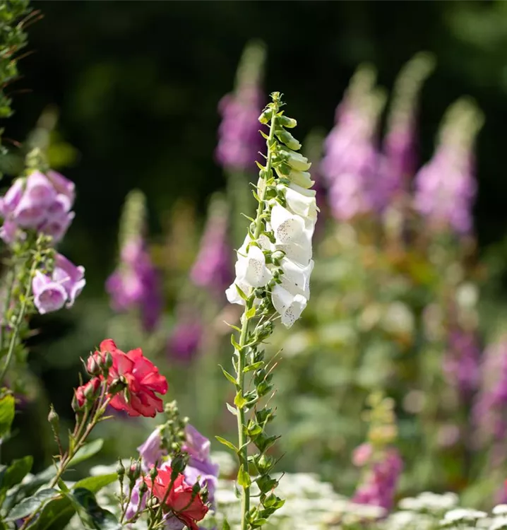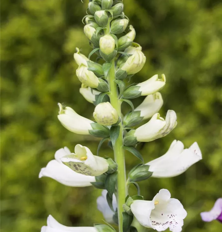 Digitalis purpurea, weiß bildet trichterförmige, weiße Blüten ab Juni.