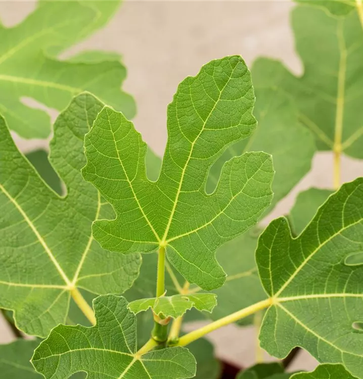 Die sommergrünen Blätter des Feigenbaums 'Firoma'® sind dunkelgrün, glänzend, gelappt.