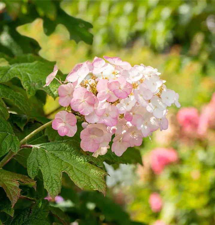 Die weißen Blüten der Eichenblättrigen Hortensie 'Snow Queen' erscheinen in Rispen von Juni bis August. Diese werden etwa 10 - 20 cm groß und sind leicht duftend.