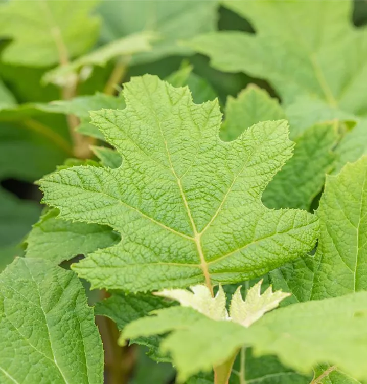 Die sommergrünen Blätter der Eichenblättrige Hortensie 'Snow Queen' sind dunkelgrün, eiförmig, gegenständig, gelappt. Eichenblättrige Hortensie 'Snow Queen' zeigt sich leuchtend purpurrot im Herbst.