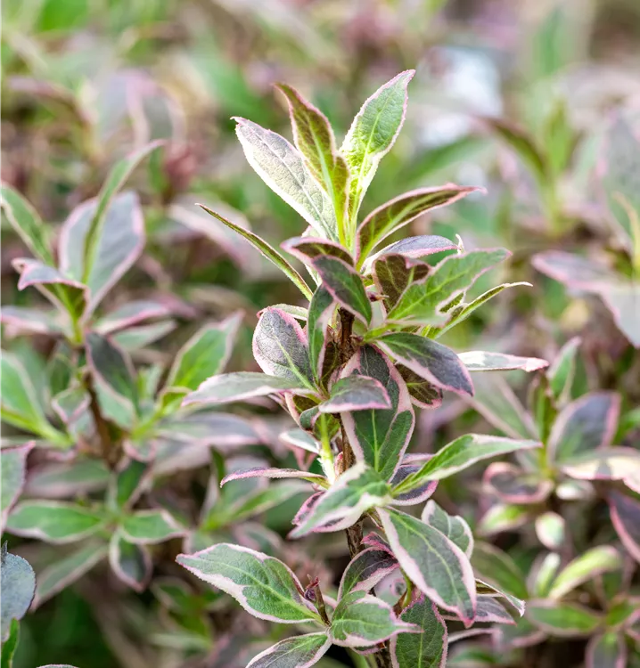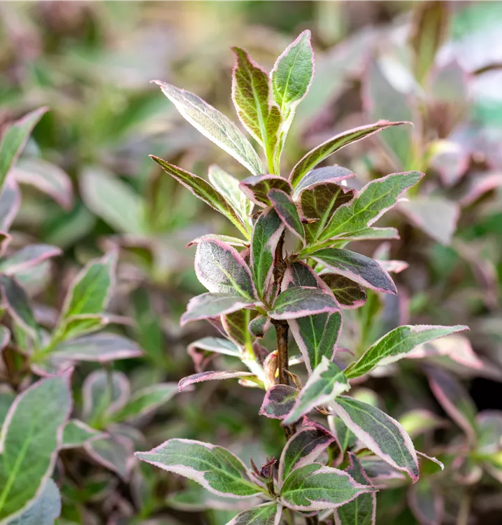 Hoher Blattschmuckwert. Die sommergrünen Blätter der Weigelie 'All Summer Monet'® sind mittelgrün, eiförmig, gegenständig und weisen einen weiß-rosafarbenen Rand auf. Diese sind etwa 6 - 10 cm groß. Weigelie 'All Summer Monet'® zeigt sich leuchtend rotviolett im Herbst. Lange haftend.
