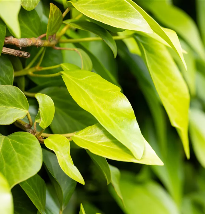 Hoher Blattschmuckwert. Die immergrünen Blätter des Kaukasischen Efeus 'Russland' sind dunkelgrün, eiförmig, herzförmig, ledrig, wechselständig.