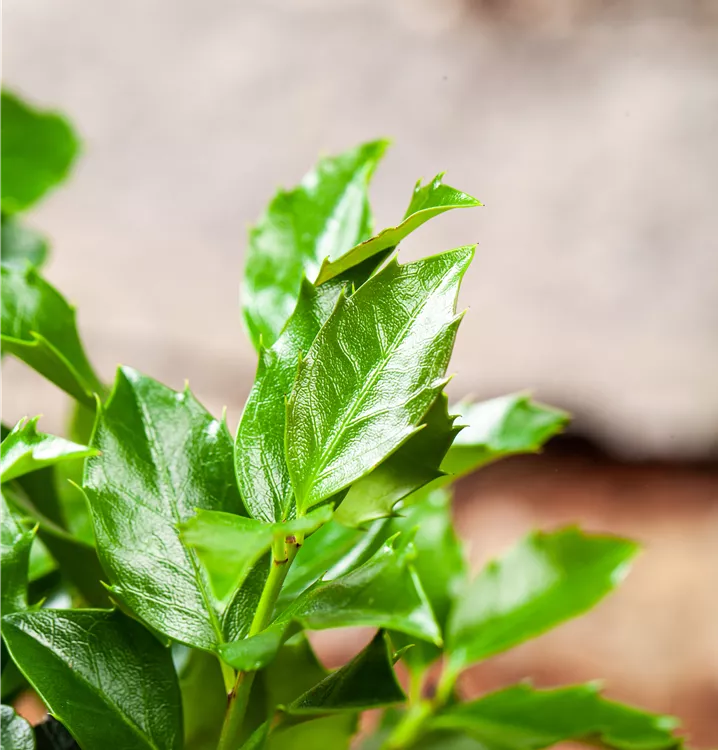 Die immergrünen Blätter der Stechpalme 'Blue Maid' sind dunkelgrün, lanzettlich.
