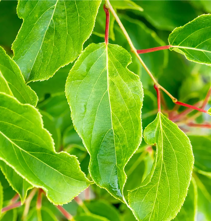 Die sommergrünen Blätter der Duo-Kiwi sind dunkelgrün, eiförmig, wechselständig, gesägt. Diese sind etwa 8 - 12 cm groß. Die Duo-Kiwi zeigt sich leuchtend gelb im Herbst.