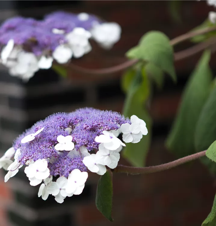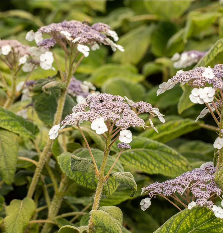 Die violetten Blüten der Samt-Hortensie erscheinen in Rispen von Ende Juli bis Mitte September. Diese werden etwa 15 - 30 cm groß.