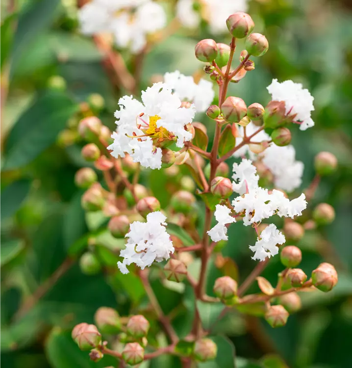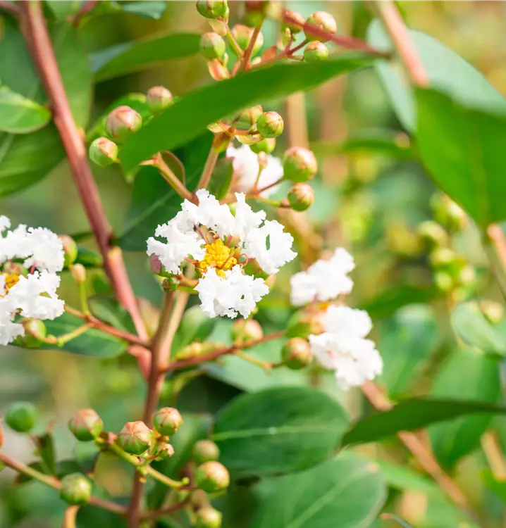 Lagerstroemia indica 'White Star' bildet weiße Blüten ab Juli.