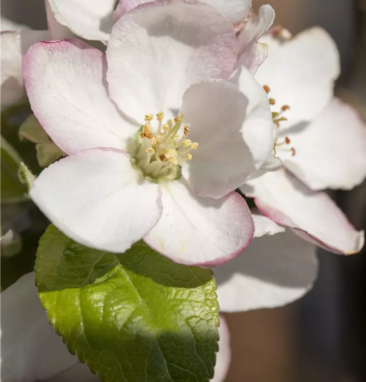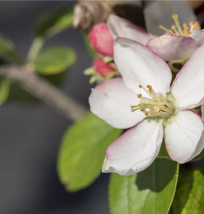 Malus domestica 'Goldparmäne' bildet hellrosafarbene Blüten ab April.