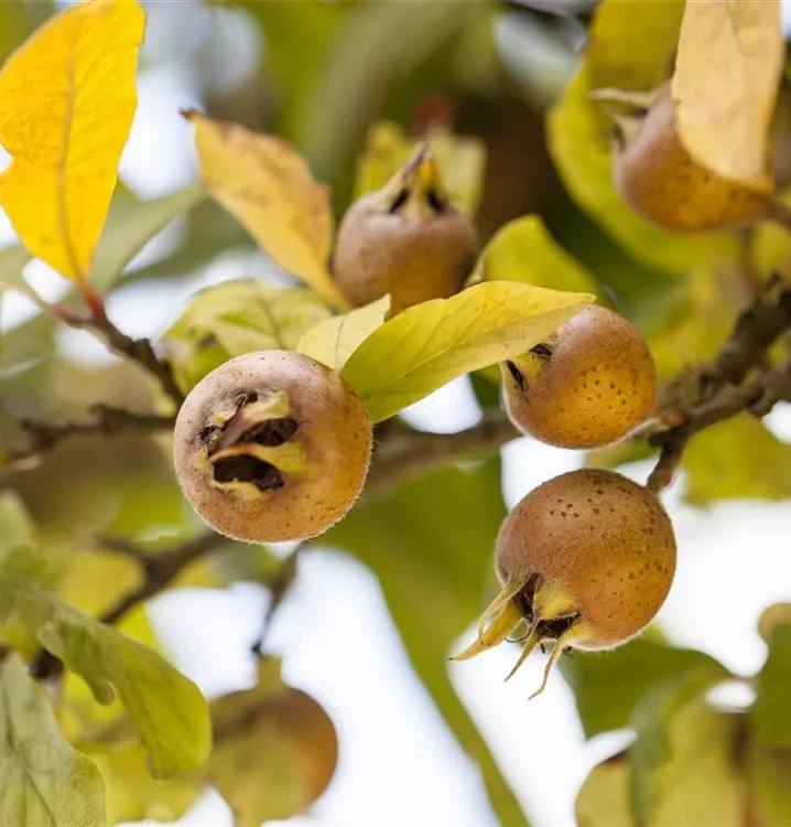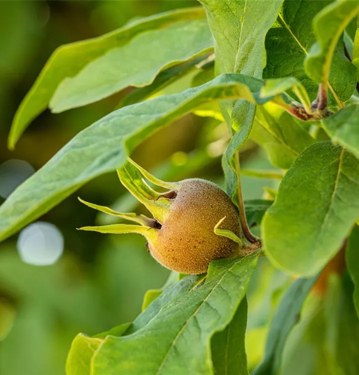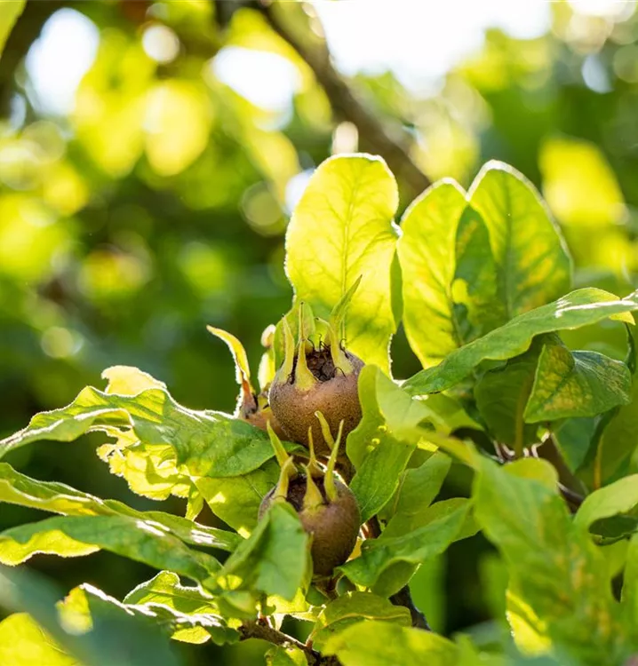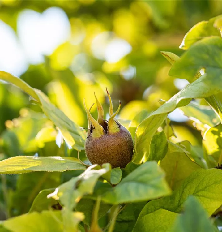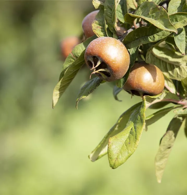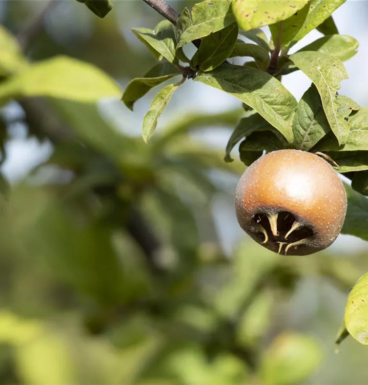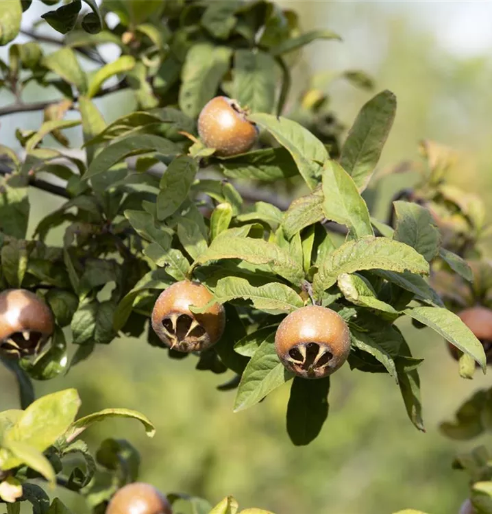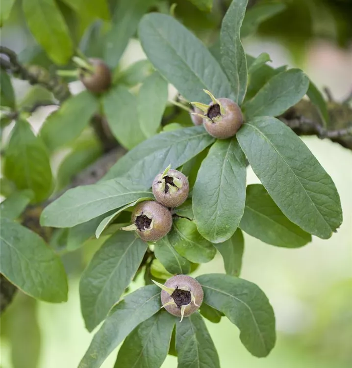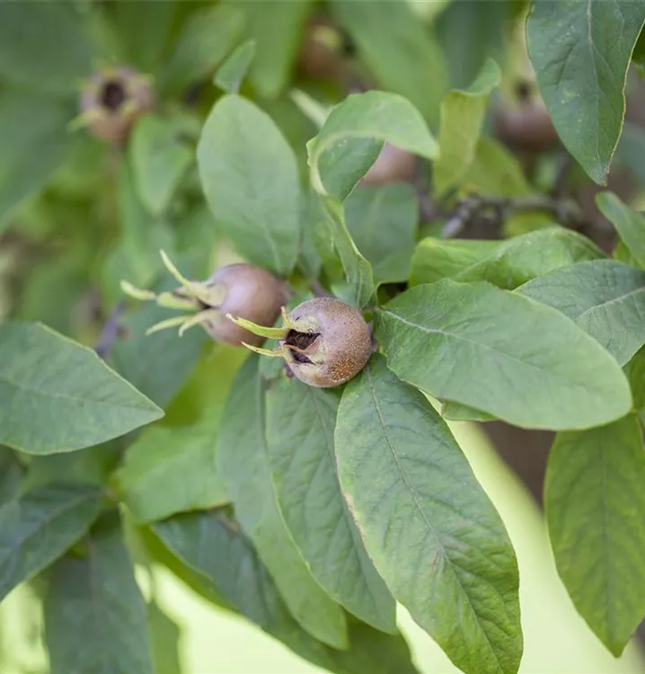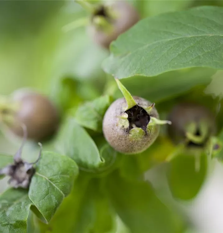 Mespilus germanica bildet braune Früchte mit einem süßen, nussigen Geschmack. Die Fruchtschale dieser flachen Früchte ist rau. Reifezeit ab November.