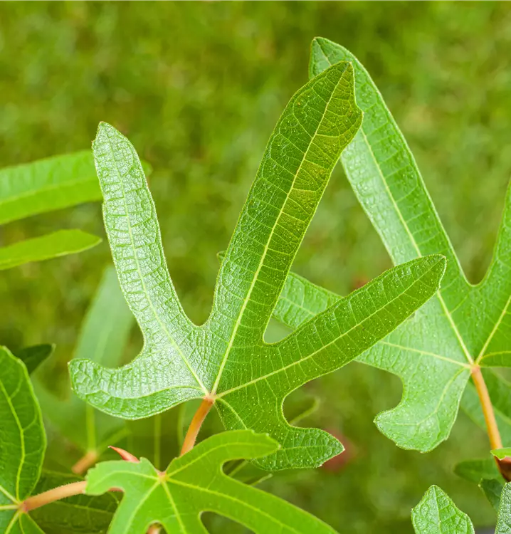 Die sommergrünen Blätter der Feige 'Rouge de Bordeaux' sind mittelgrün, glänzend, gelappt.