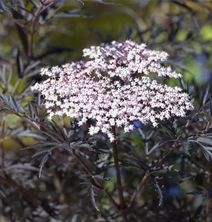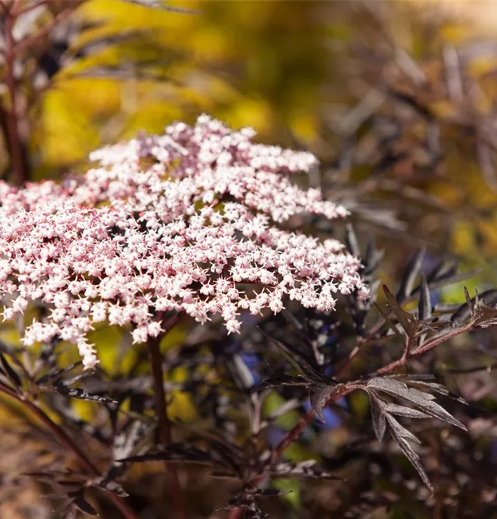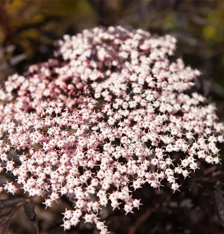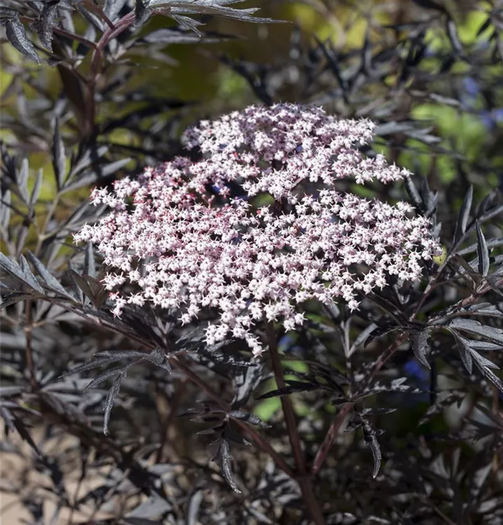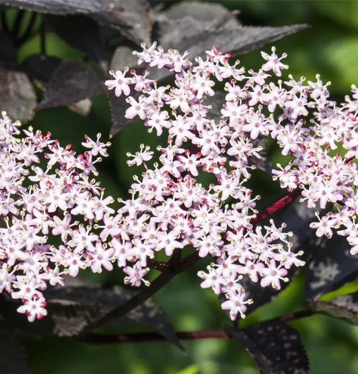 Die rosafarbenen Blüten des Schwarzen Holunder 'Black Lace'(s) erscheinen in Schirmtrauben von Juni bis Juli. Diese sind leicht duftend.