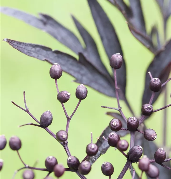 Hoher Blattschmuckwert. Die sommergrünen Blätter des Schwarzen Holunders 'Black Lace'(s) sind schwarz-blau, gefiedert, gegenständig, zerschlitzt. Schwarzer Holunder 'Black Lace'(s) zeigt sich leuchtend gelb im Herbst. Lange haftend.