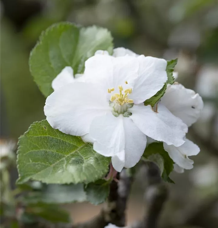 Die sommergrünen Blätter des Apfels 'Roter Boskoop' sind mittelgrün, eiförmig, gesägt.