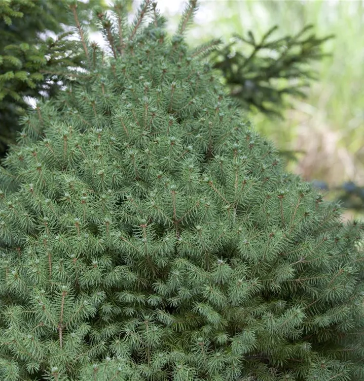 Zuckerhut-Fichte 'Conica' ist ein kegelförmig und dicht wachsender Baum oder Strauch. Sie erreicht gewöhnlich eine Höhe von 3 - 4 m und wird ca. 1 - 2 m breit. Langsam wachsend. In der Regel wächst sie 5 - 10 cm pro Jahr.