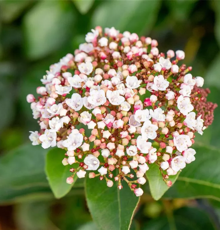 Die hellrosafarbenen Blüten des Lorbeer-Schneeball 'Spirit' erscheinen in Schirmtrauben von März bis April. Diese sind leicht duftend. Bei richtiger Pflege Nachblüte im November.