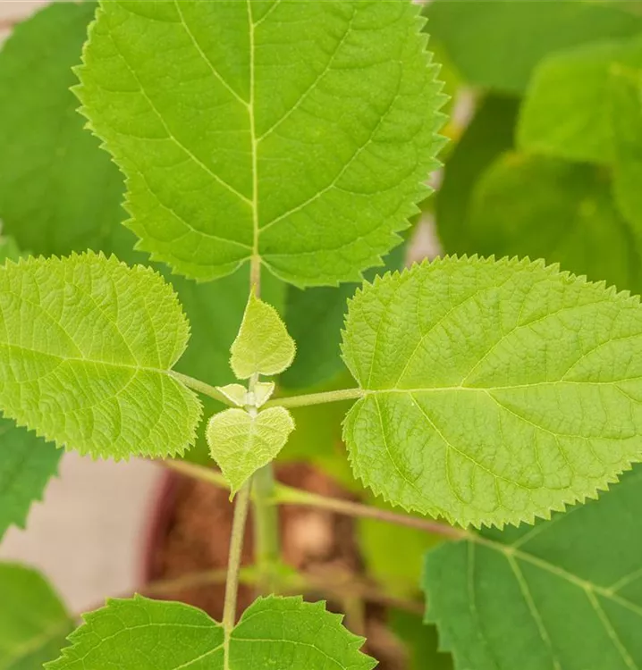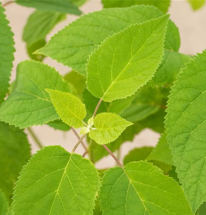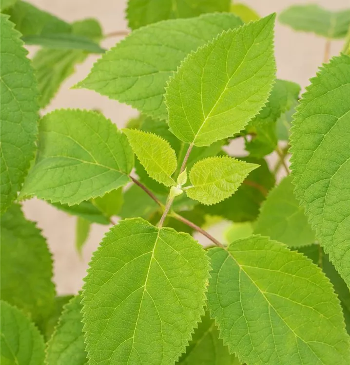 Die sommergrünen Blätter der Ballhortensie 'Strong Annabelle'® sind mittelgrün, eiförmig, gegenständig.