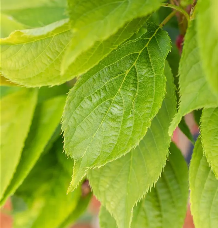 Die sommergrünen Blätter der Japanische Säulenkirsche 'Amanogawa' sind dunkelgrün, eiförmig, lanzettlich, wechselständig, gesägt. Diese sind etwa 8 - 12 cm groß. Bronzefarbener Austrieb. Japanische Säulenkirsche 'Amanogawa' zeigt sich leuchtend orangegelb im Herbst.