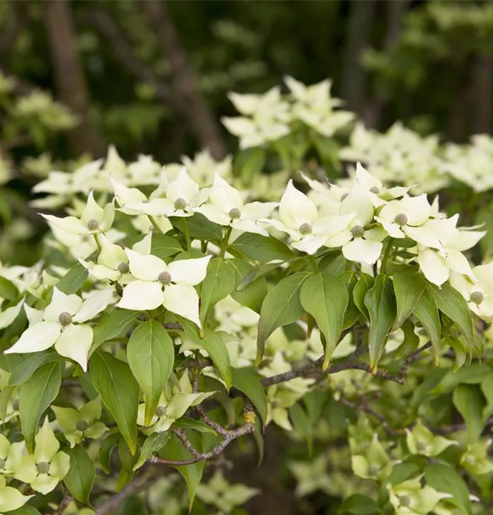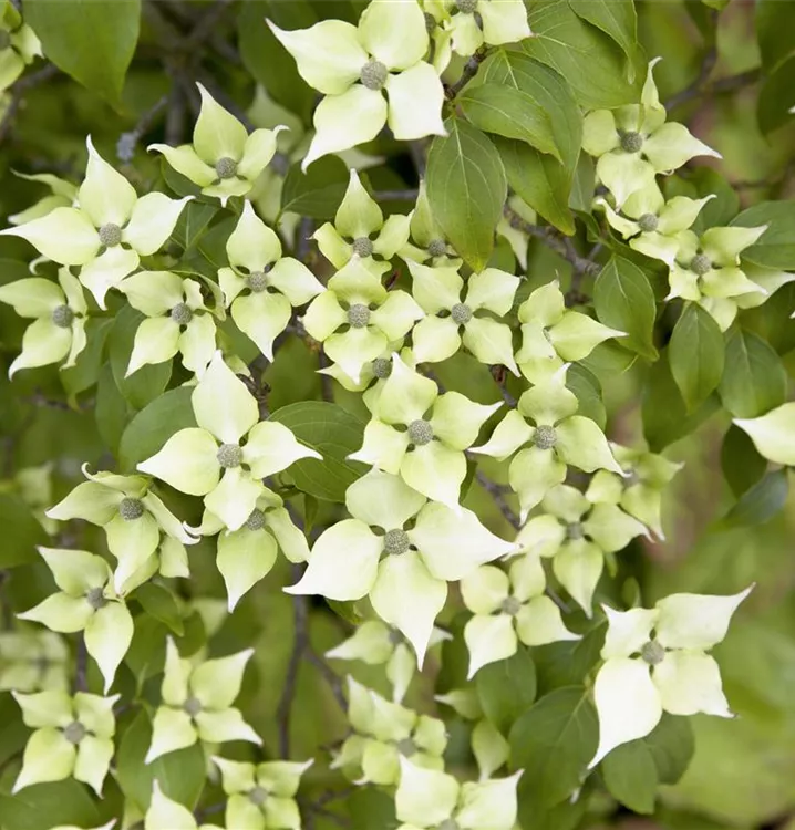 Die weißen Blüten des Chinesischen Blumen-Hartriegel erscheinen in Dolden von Ende Mai bis Juni. Diese werden etwa 8 - 10 cm groß.