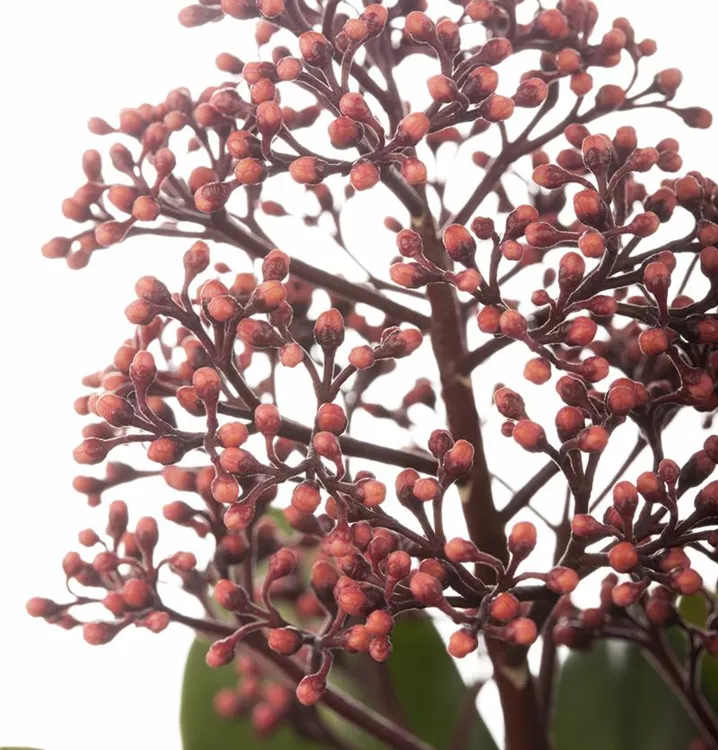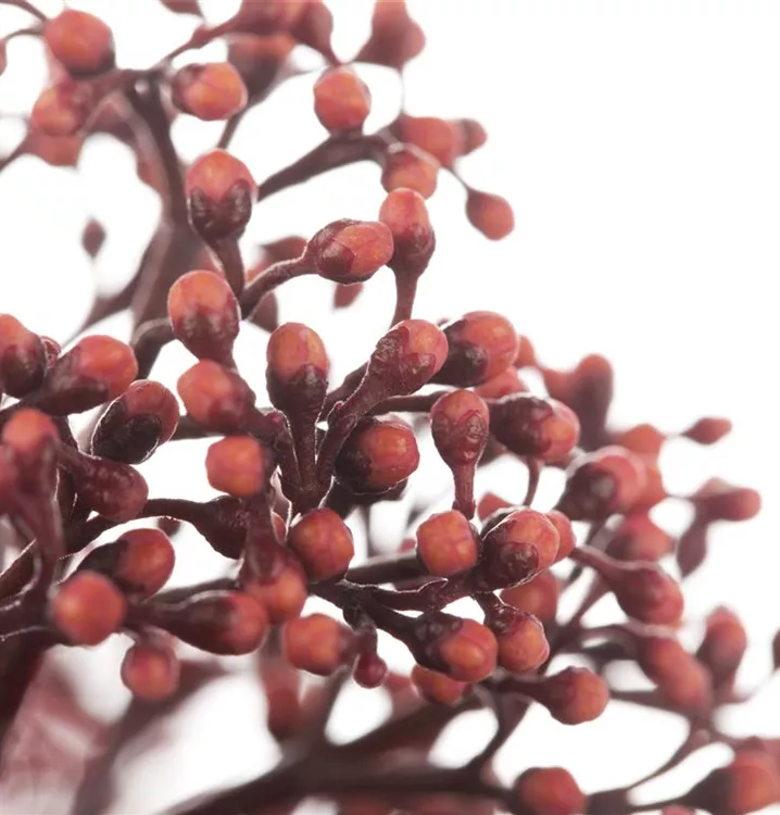 Japanische Blütenskimmie 'Rubella' ist ein buschig und kompakt wachsender Kleinstrauch. Sie erreicht gewöhnlich eine Höhe von 0,6 - 1 m und wird ca. 0,6 - 1,5 m breit. Langsam wachsend. In der Regel wächst sie 10 - 20 cm pro Jahr.