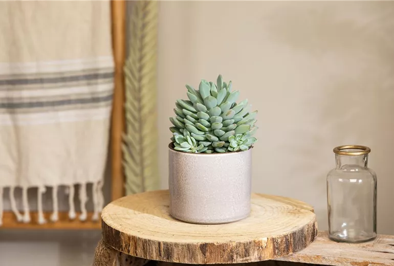 Ein gesundes und üppiges Wachstum steht und fällt mit dem richtigen Substrat. Deshalb gehört zum Kakteen und Sukkulenten pflegen in erster Linie, das richtige Zuhause zu finden. Das sollte an die natürliche Umgebung der Wüstenbewohner angepasst sein. Was das bedeutet? Wo viele andere Pflanzen dankend ablehnen, freuen sich Kakteen und Sukkulenten über einen sandigen, nährstoffarmen und eher trockenen Untergrund. Dafür kann man entweder spezielle Kakteenerde verwenden, oder man mischt sich das ideale Substrat aus verschiedenen Materialen zusammen. In jedem Fall sollte man darauf achten, dass das Gefäß, indem die Pflanzen wachsen, Abzugslöcher enthält. Zum Kakteen und Sukkulenten pflegen gehört nämlich auch das richtige Gießverhalten. Und Staunässe gilt es dabei unbedingt zu vermeiden. Mit der kommen die Gewächse trotz ihrer Robustheit nicht zurecht und bevorzugen lieber ein trockenes Zuhause.