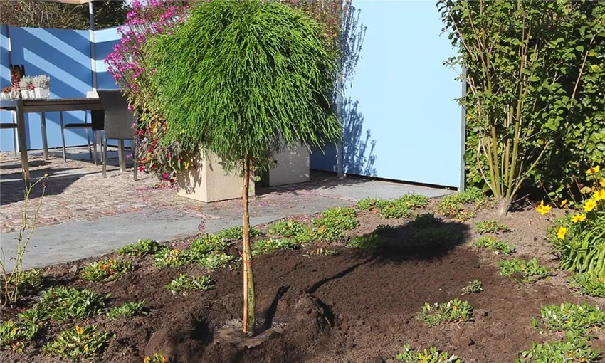 Fadenzypresse - Einpflanzen im Garten (5) Nach dem Einpflanzen treten Sie die Erde gut an und wässern sie gründlich. Bei einem Hochstamm sollten Sie noch einmal prüfen, ob der Stamm gerade ausgerichtet ist.