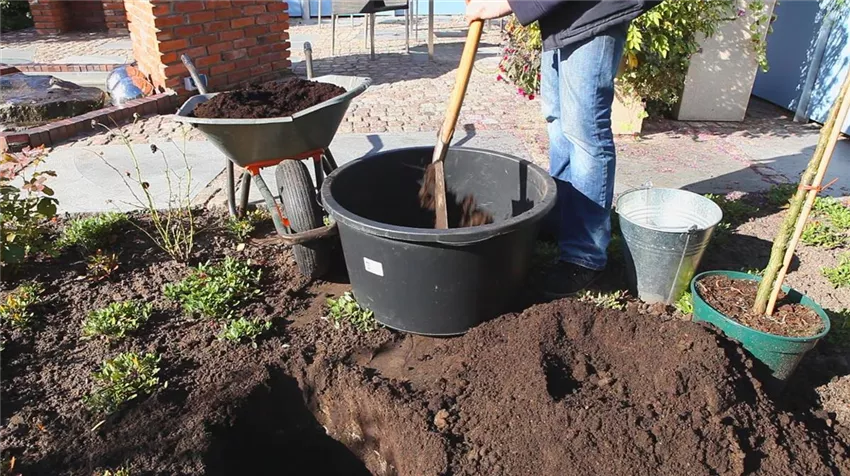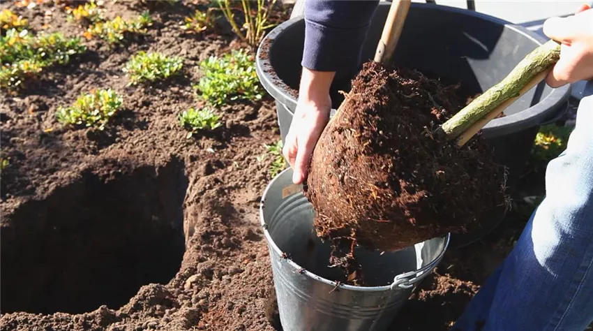 Mischen Sie den Erdaushub mit Kompost, Mutterboden oder gekaufter Erde. Eventuell können Sie gleich bei der Pflanzung organischen Dünger zufügen (wenn Sie das Erdloch mit gedüngter Qualitätserde aus dem Fachhandel auffüllen, entfällt diese Düngergabe).