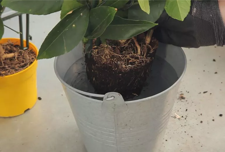 Der Wurzelballen wird vor dem Umsetzen gut gewässert.