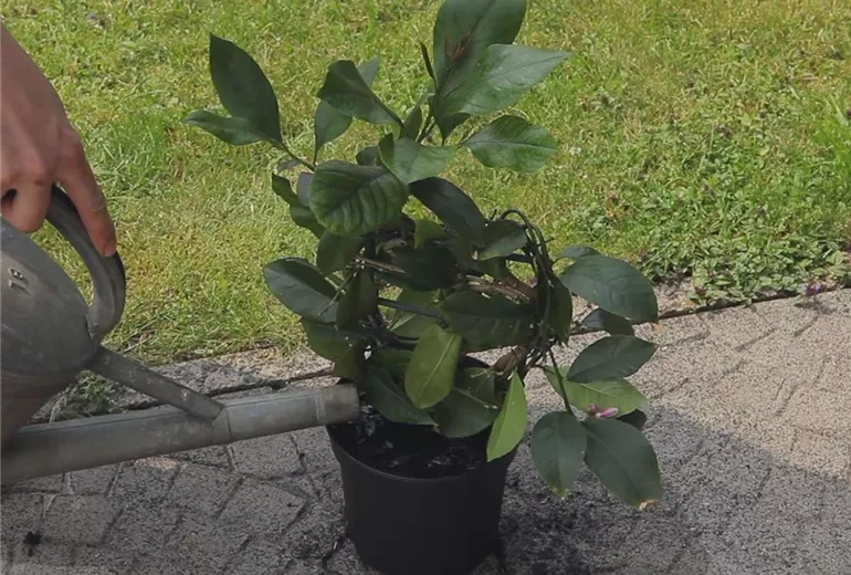 Das Angießen nach dem Umtopfen dient nicht vorrangig der Wasserversorgung der Zitrone, vielmehr sorgt das Wasser dafür, dass im Topf keine Hohlräume entstehen bzw. bleiben.